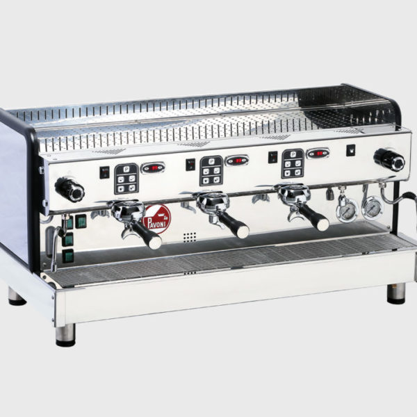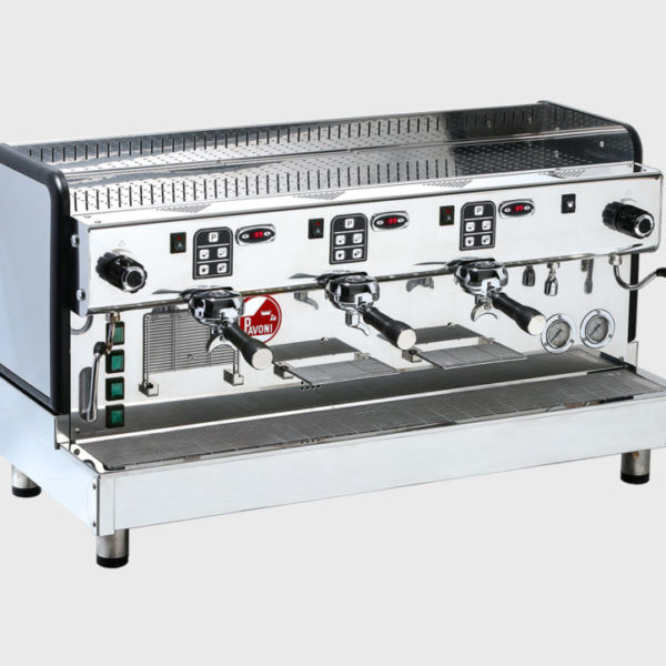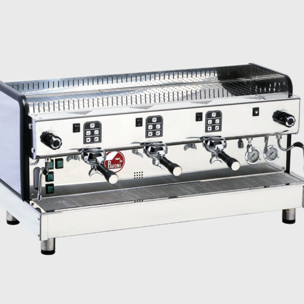 Máquina exprés programable electrónica de dosificación, 3 grupos, con pad de control digital y microprocesador.